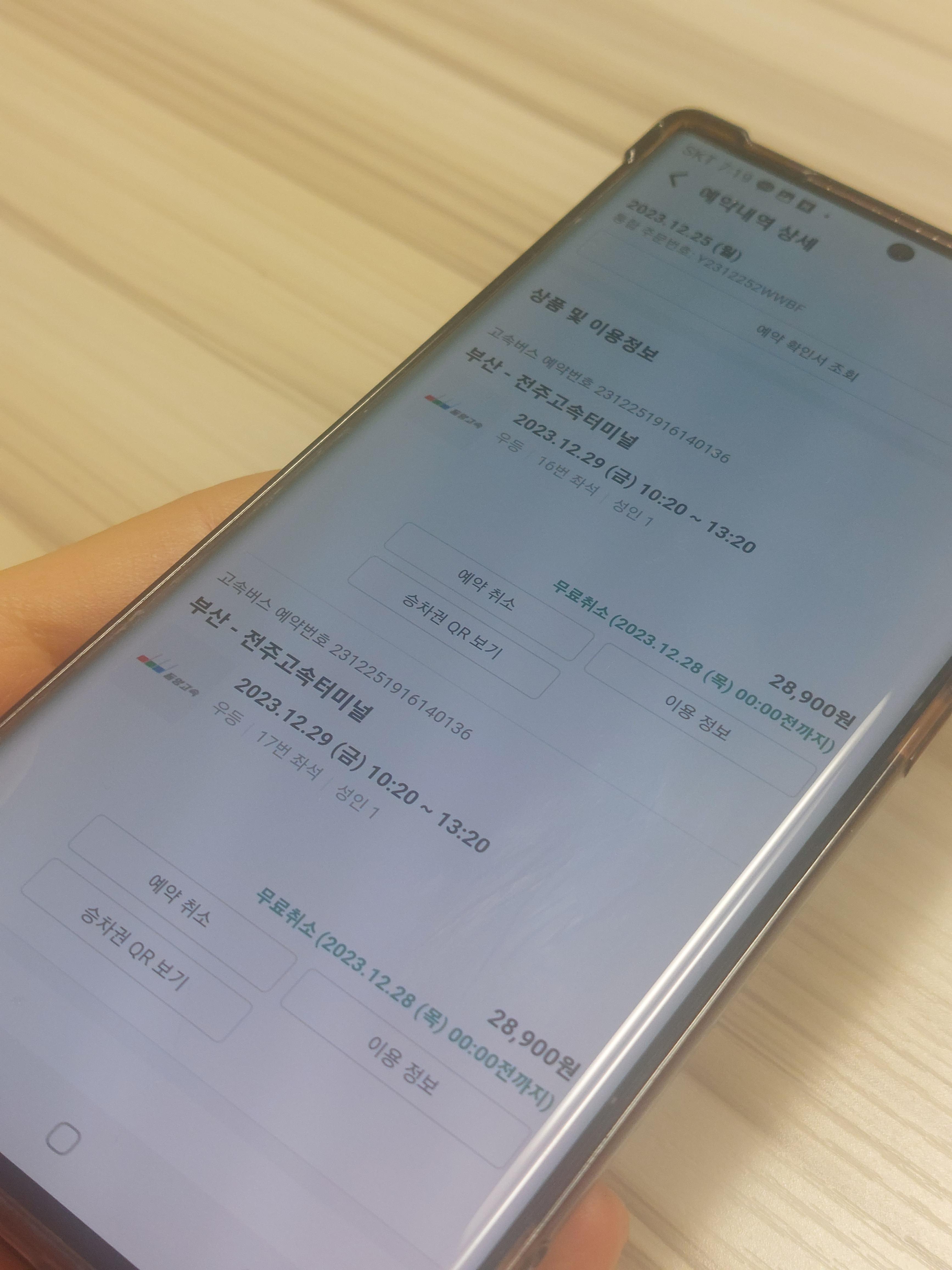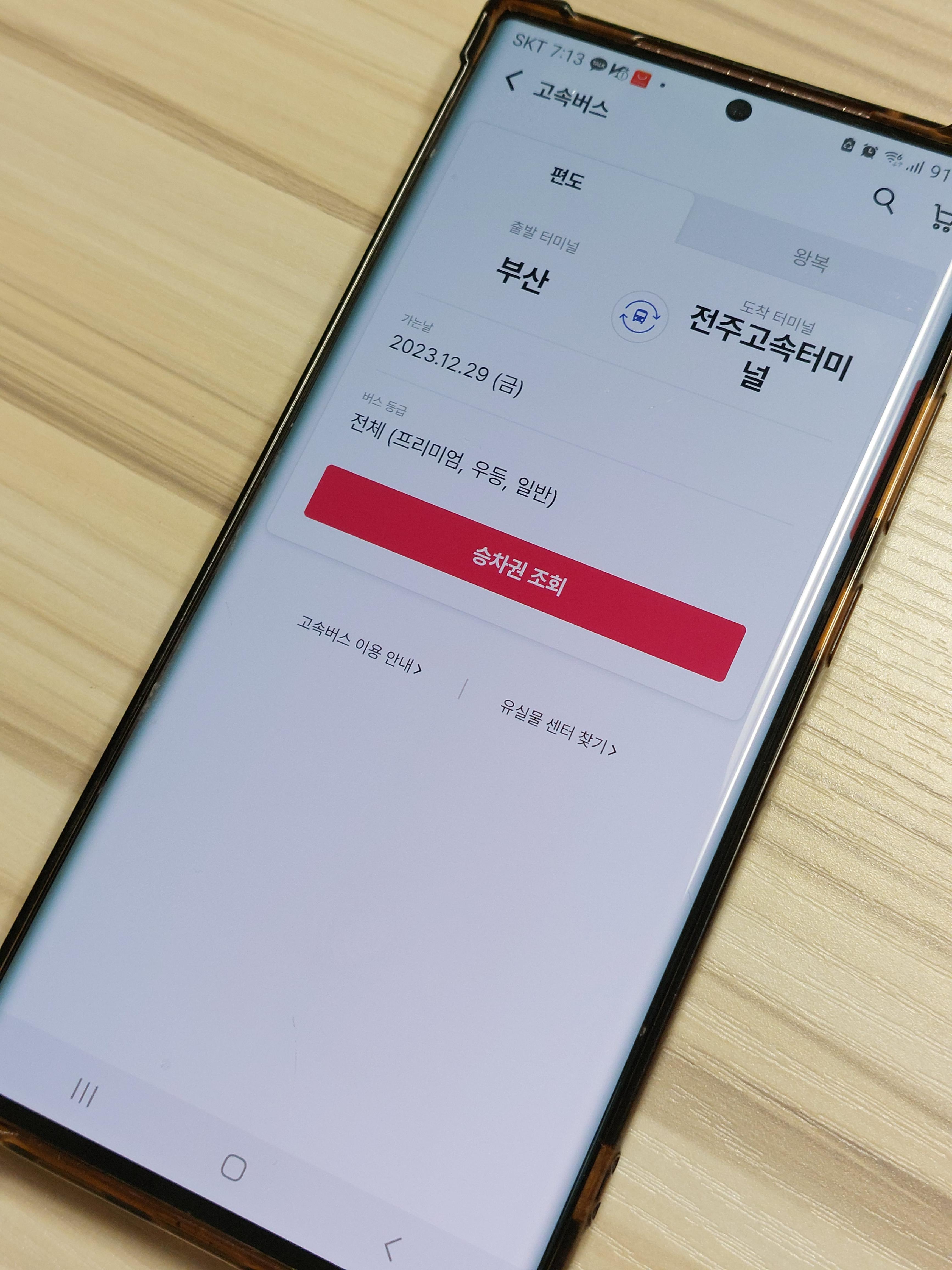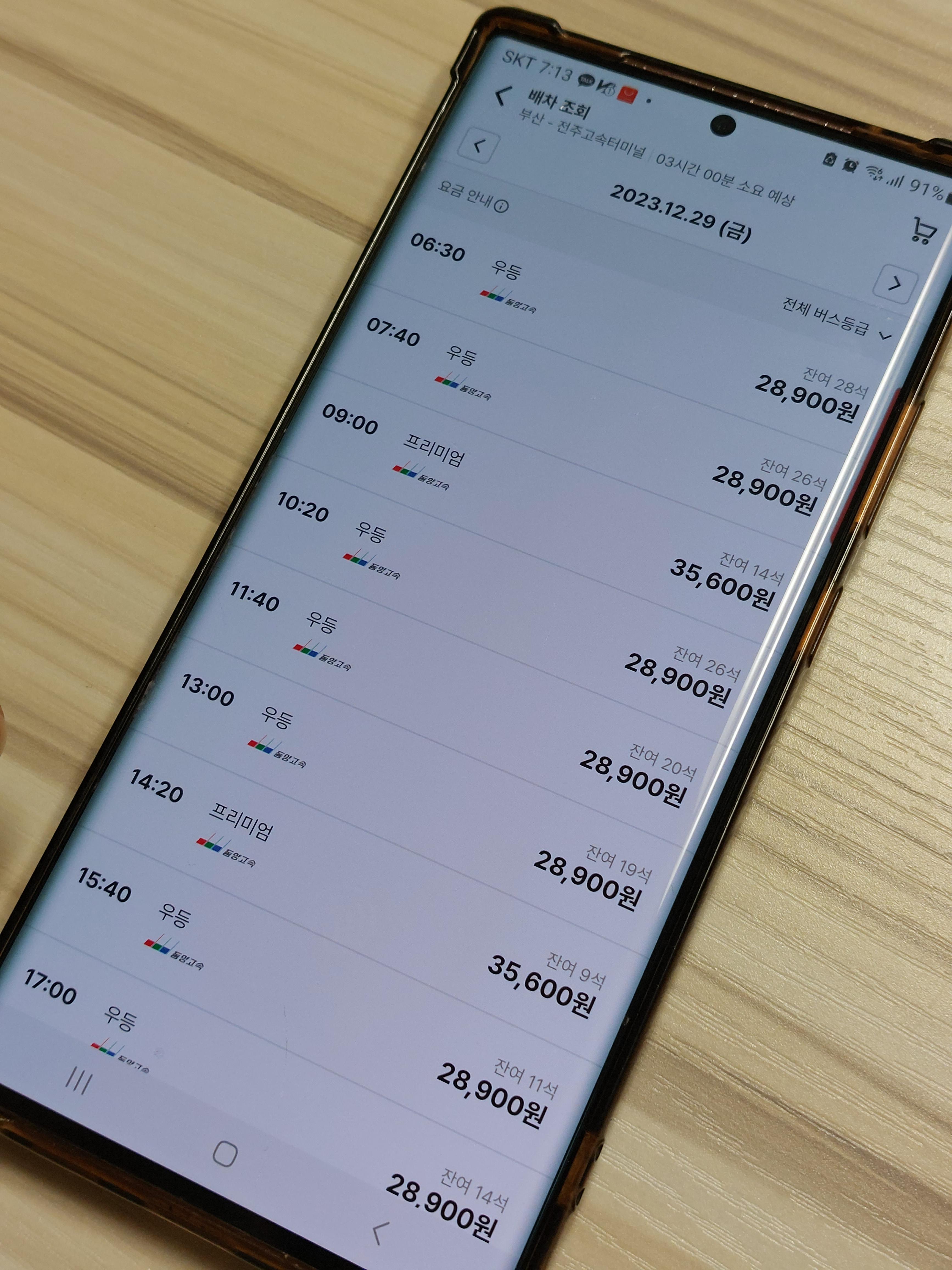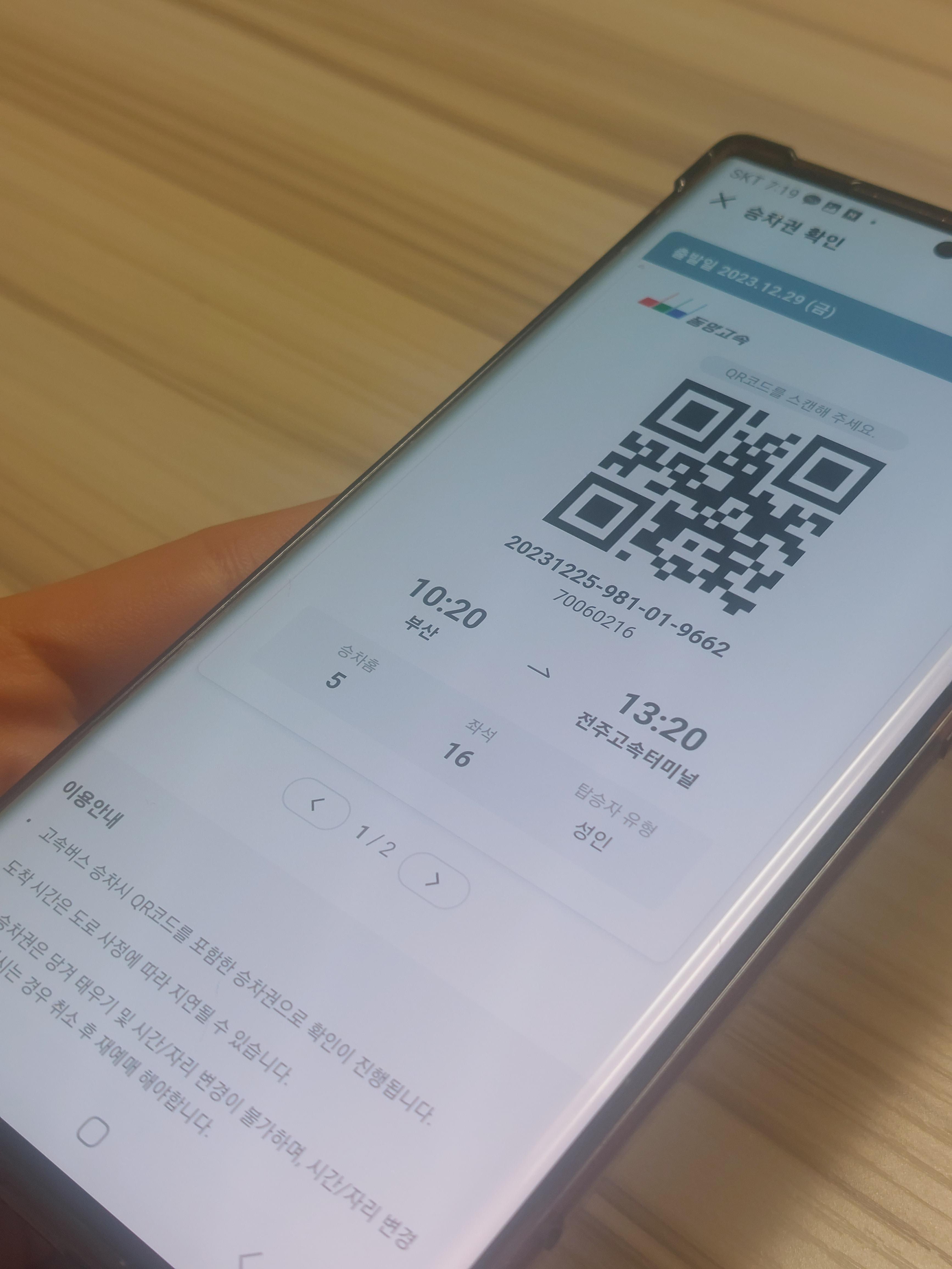 저는 2023년 12월 29일(금요일) 부산에서 전주로 향하는 고속터미널 편도권을 예매해 보았는데 승차권을 조회하면 이렇게 출발 시간과 버스 등급, 잔여 좌석과 요금이 나옵니다.