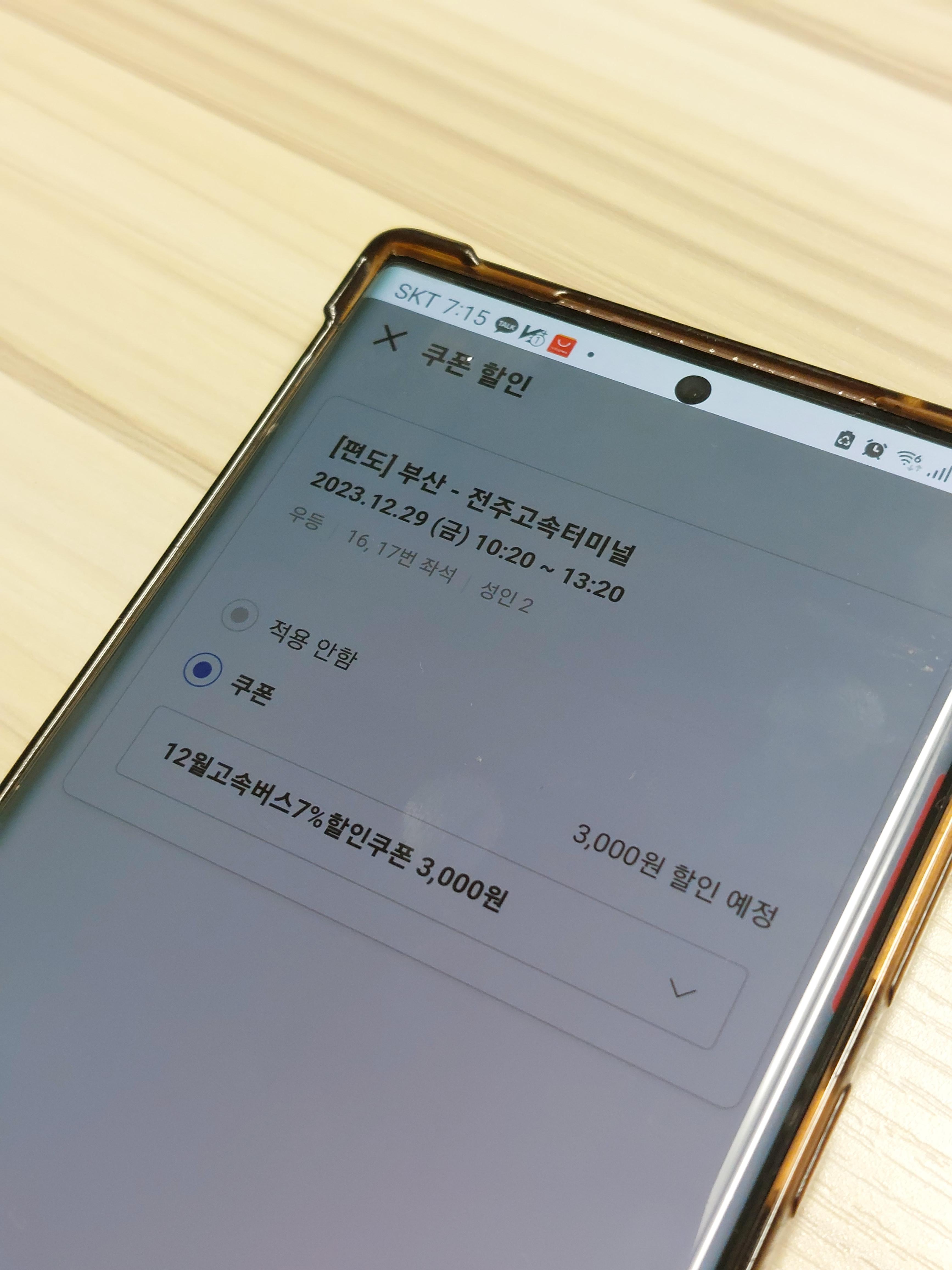 이후 결제란에 쿠폰 선택란을 누르면 12월 고속버스 7% 할인 최대 3천 원 할인 쿠폰을 적용할 수 있습니다. 참고로 NOL 카. 드가 있다면 야놀자 첫 결제 시, 2만 원 청구 할인 서비스도 받을 수 있습니다.