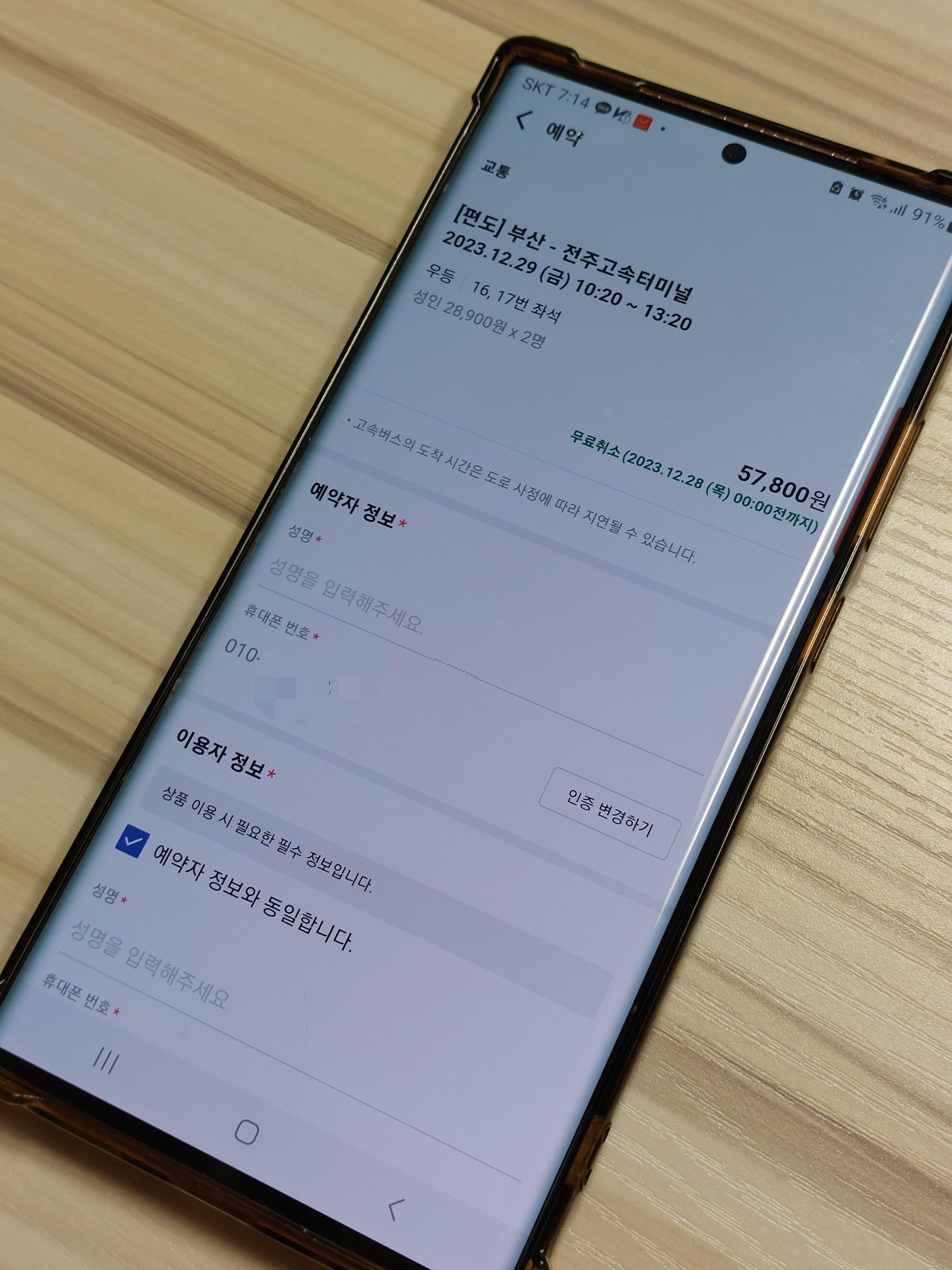 여기서 장바구니 담기가 아닌 바로 예매하기를 누르면 예약자 정보란에 성명과 휴대폰 번호를 입력하게 되어 있습니다. 참고로 고속버스 예매 무료 취소는 출발 하루 전까지 가능합니다.