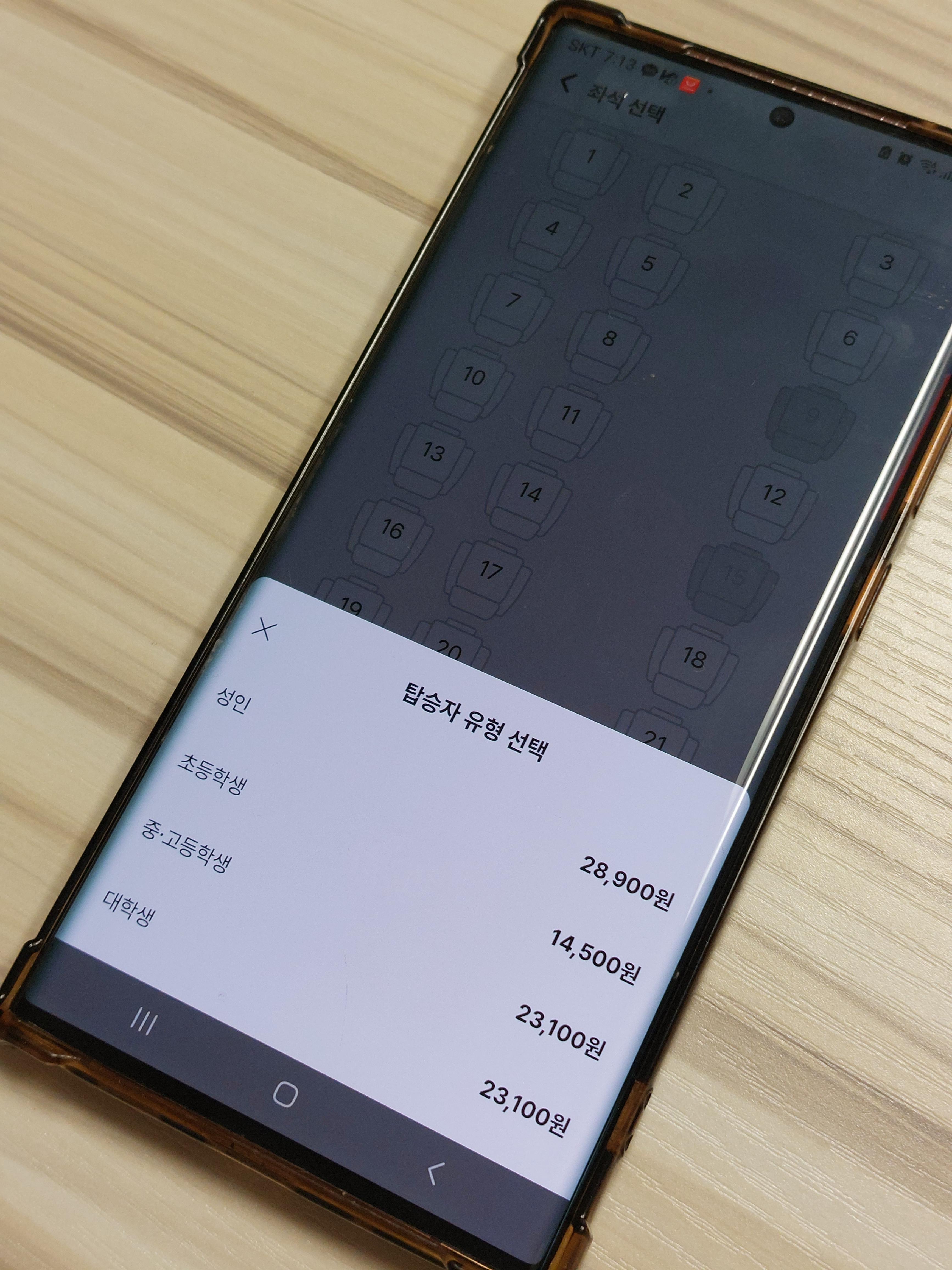 출발 시간을 눌렀다면 그다음 좌석을 선택해 주고 탑승자 유형(성인, 초등학생, 중고등학생, 대학생)을 선택한 뒤 완료 버튼을 눌러줍니다.