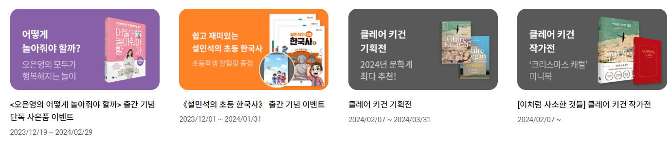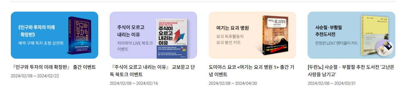 이 외에도 다양한 교보문고 인터넷 서점 이벤트에 참여하여 포인트를 적립할 수 있습니다. 교보문고 사이트나 어플에서 제공하는 이벤트를 수시로 확인하고 참여해서 조금 더 저렴하게 도서 구매하시기 바랍니다.