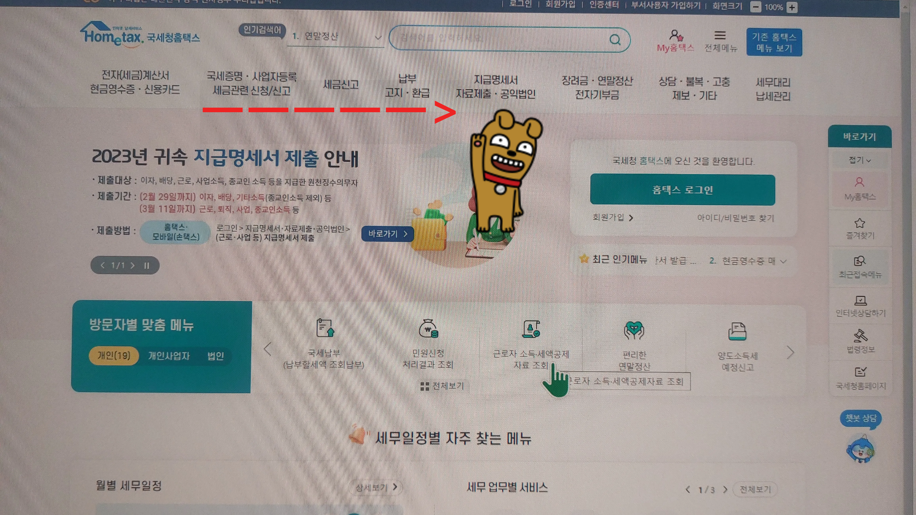 로그인을 했다면 아래 이미지처럼 다섯 번째 탭에 있는 지급명세서 자료 제출 공익법인 탭을 누르고 (근로 사업 등) 지급명세서 제출란에 근로 퇴직 소득을 눌러줍니다.