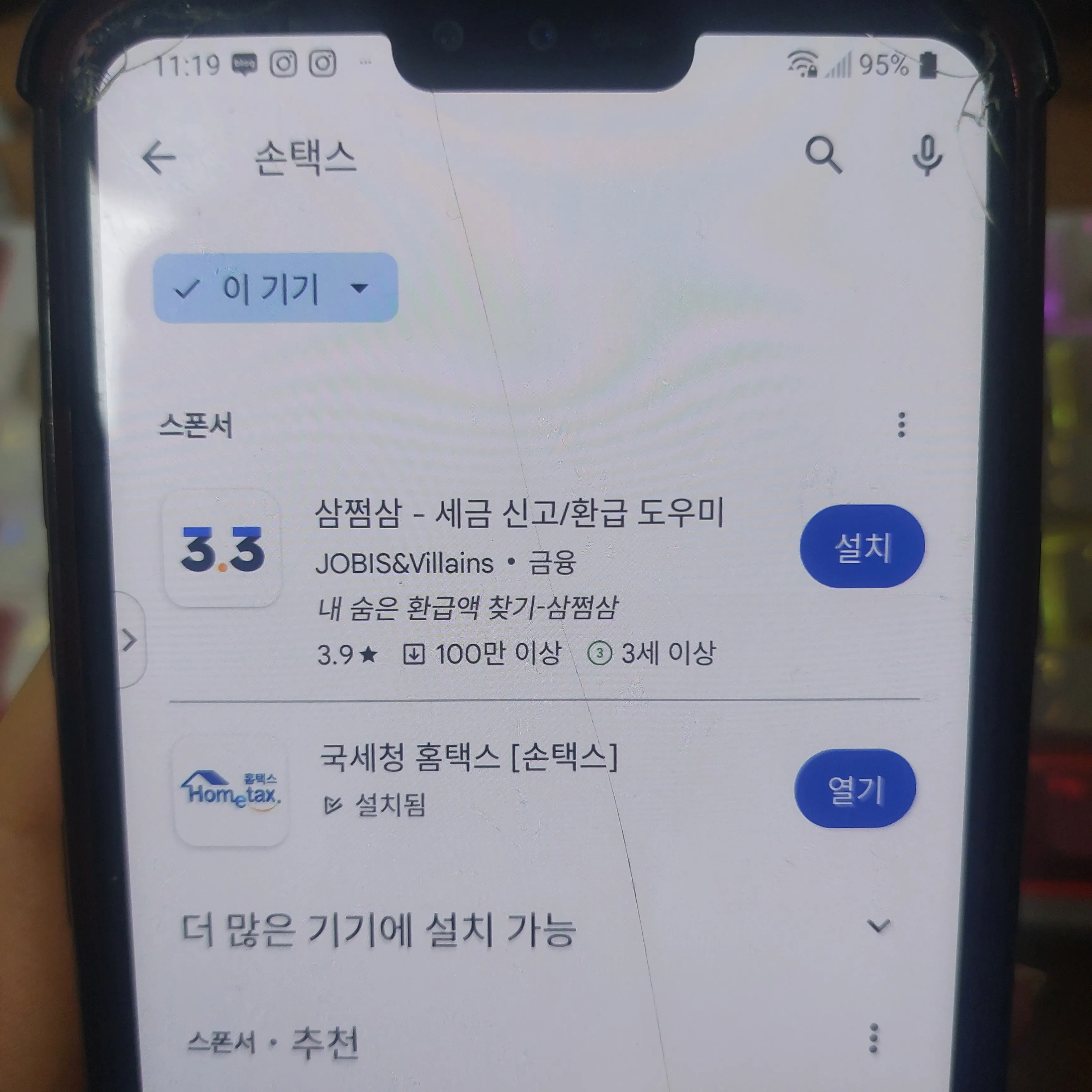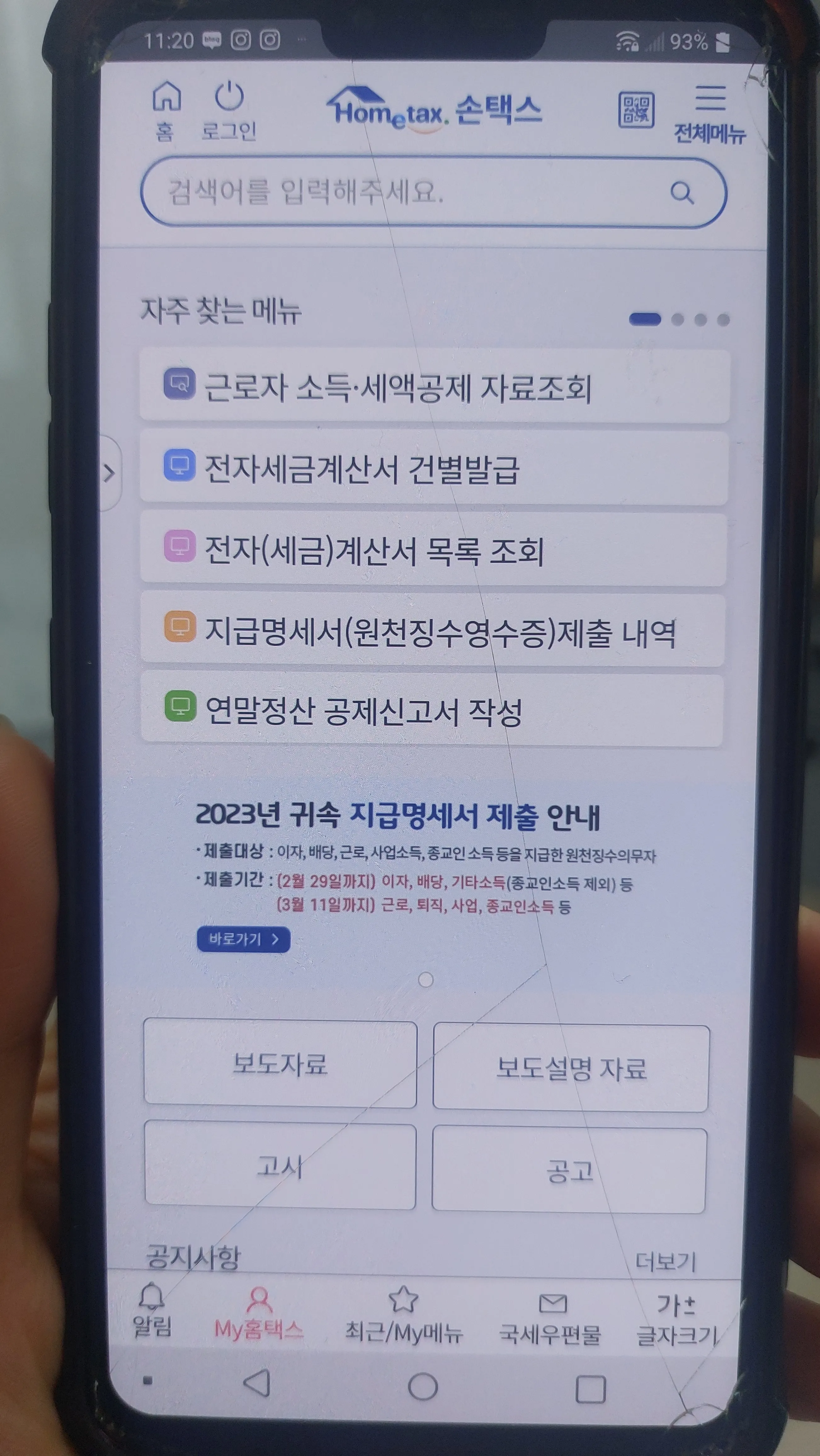 원천징수영수증은 PC 인터넷 뿐 아니라 핸드폰 모바일에서도 발급받을 수 있습니다. 국세청 홈택스 모바일 앱 버전인 손택스라는 어플을 다운로드하여 설치하면 되는데요. 동일하게 로그인을 한 뒤 MY 홈택스에서 연말정산간소화 지급명세서를 누른 뒤 지급명세서(원천징수영수증) 조회를 누르면 됩니다.