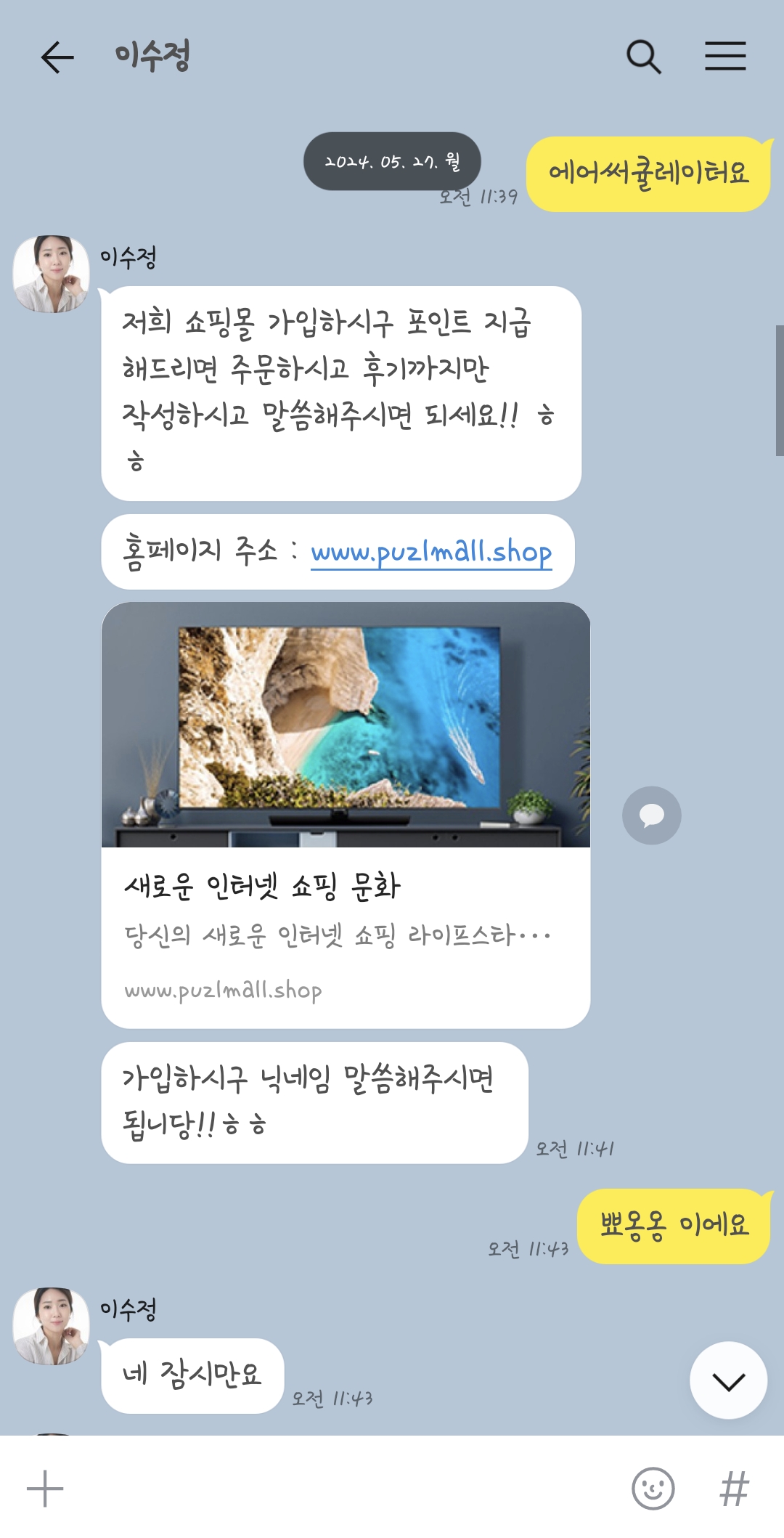 그 조선족 말투를 사용하는 여자는 퍼즐몰 마케팅 영업부에서 전화했다며, 김ㅇㅇ 회원님 맞으시냐고, 회원님이 리뷰 체험단 신청을 해서 업무 내용 설명해주는거라고요. (저 같은 경우 네이버 블로그로 실제 체험단을 진행하고 있기 때문에 말투가 이상해도 이부분에서 전화를 무조건 끊을 수는 없었답니다.)