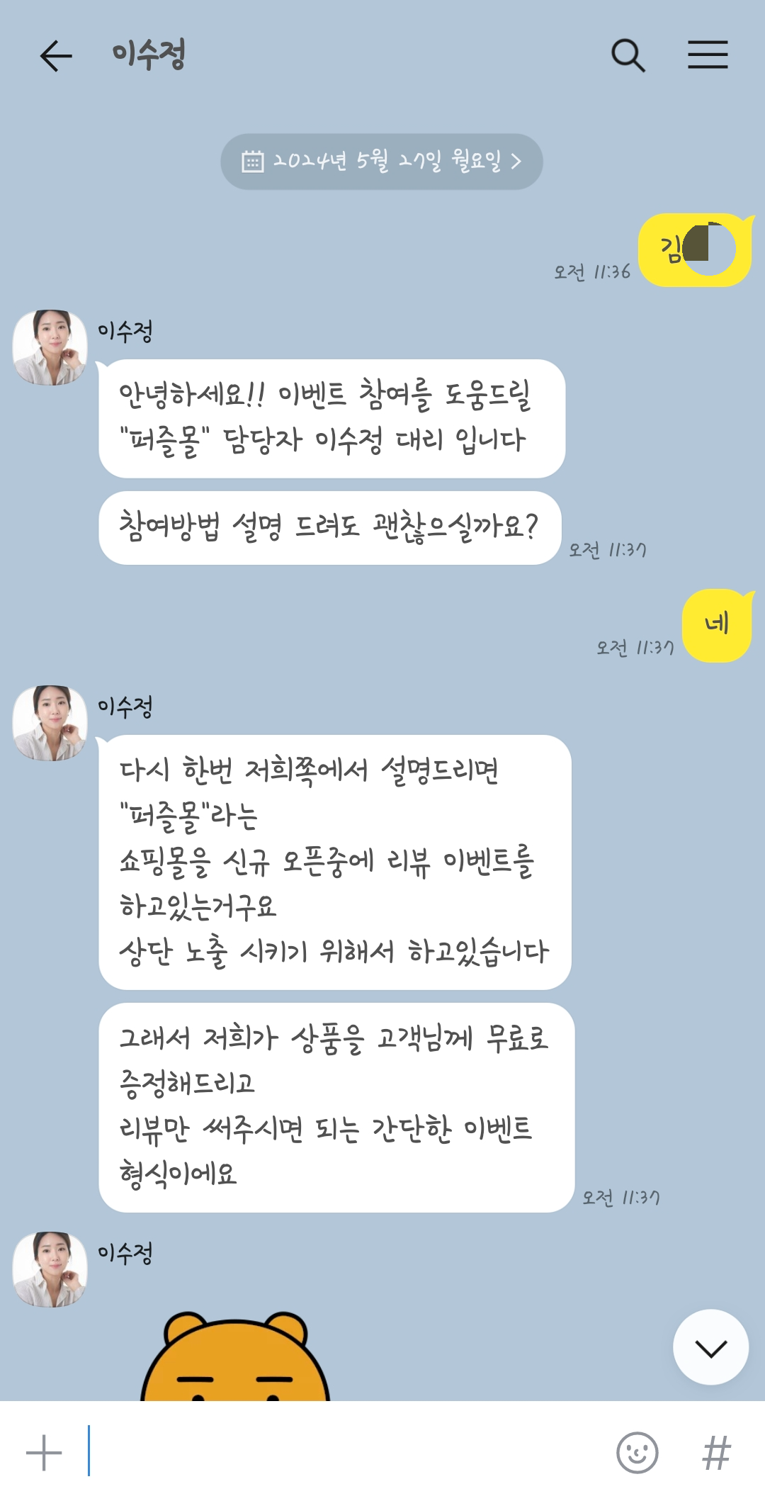 그러면서 카카오톡으로 아이디를 불러주며, 담당자 친구 추가를 하라고 하더군요. 제품은 구매해야하는거 아니고 무료로 보내준다면서요.