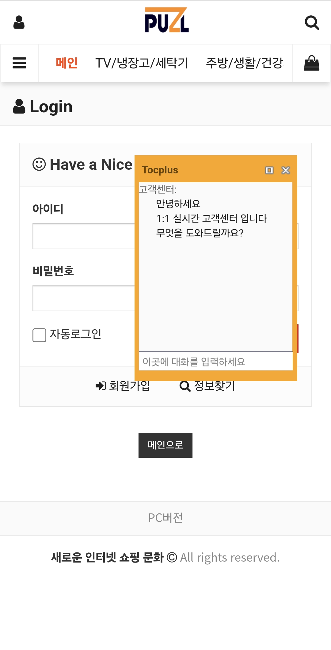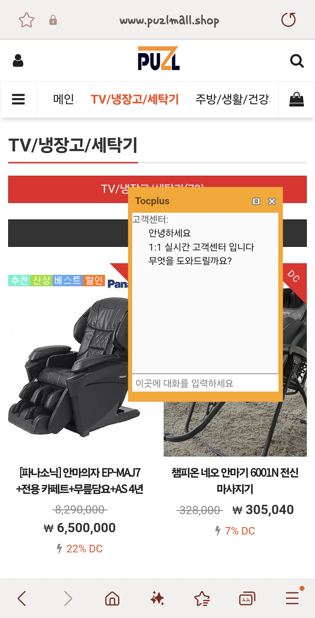 제가 신종 보이스피싱으로 사기를 당할 뻔한 인터넷 쇼핑몰 사이트는 퍼즐몰이었는데, 고객센터 연락처도 없고, 채팅으로만 실시간 상담이 가능하더라고요.