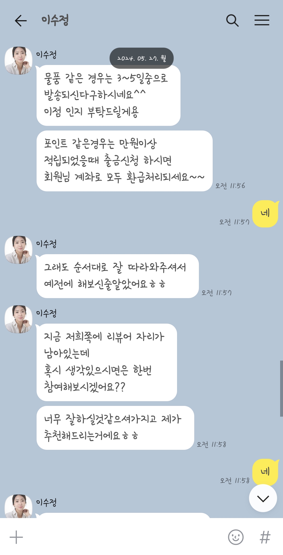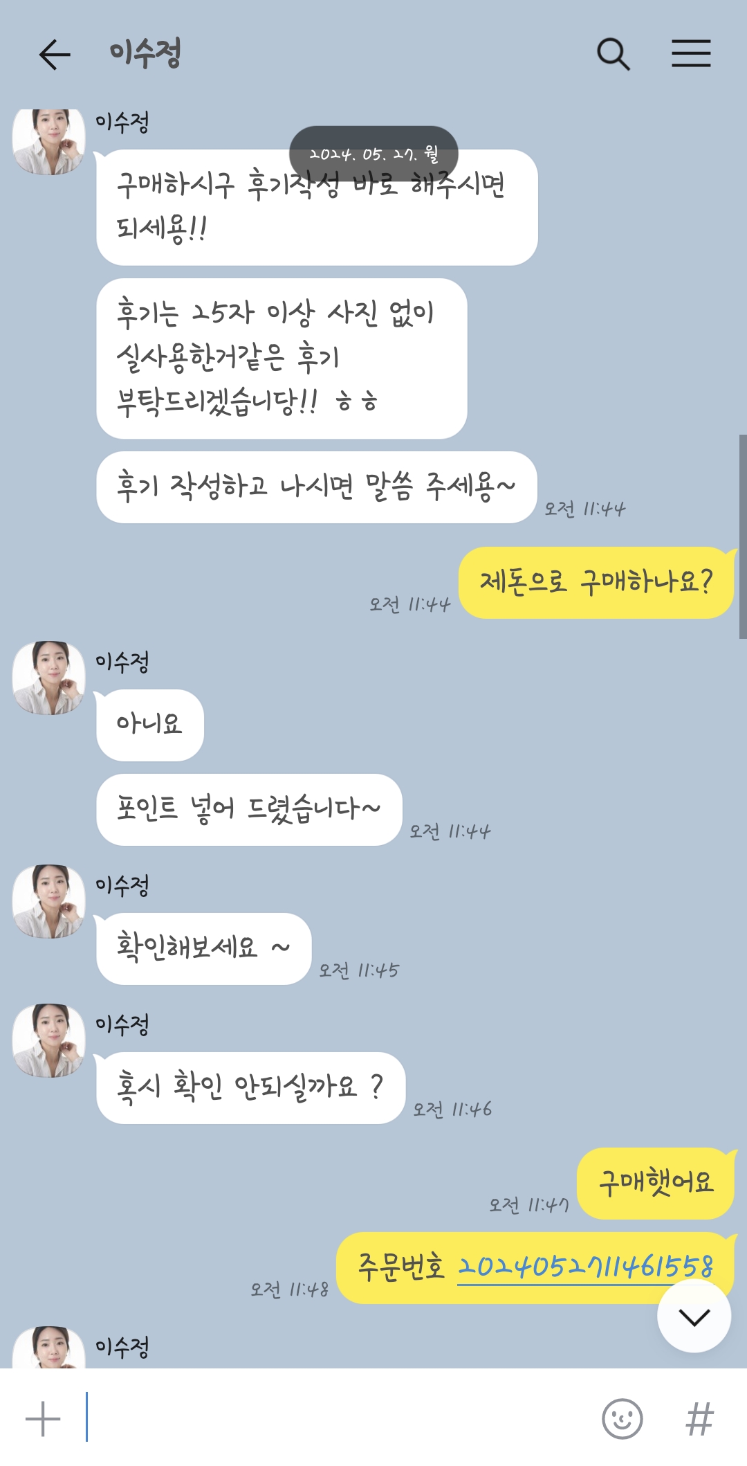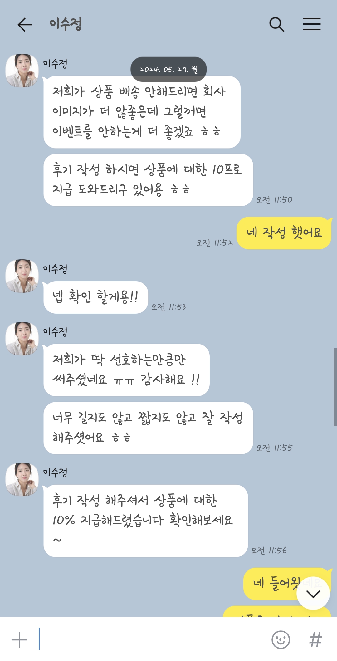 참고로 그 이후 리뷰를 잘 남겨주셨다며 본인들이 지정하는 상품을 구매하고 해당 상품 리뷰를 작성하면 완료 되는대로 제품 구매 가격과 10% 수당을 준다고 하는데, 이거 순 사기입니다.