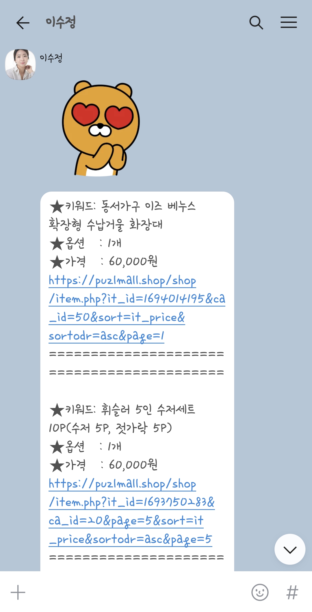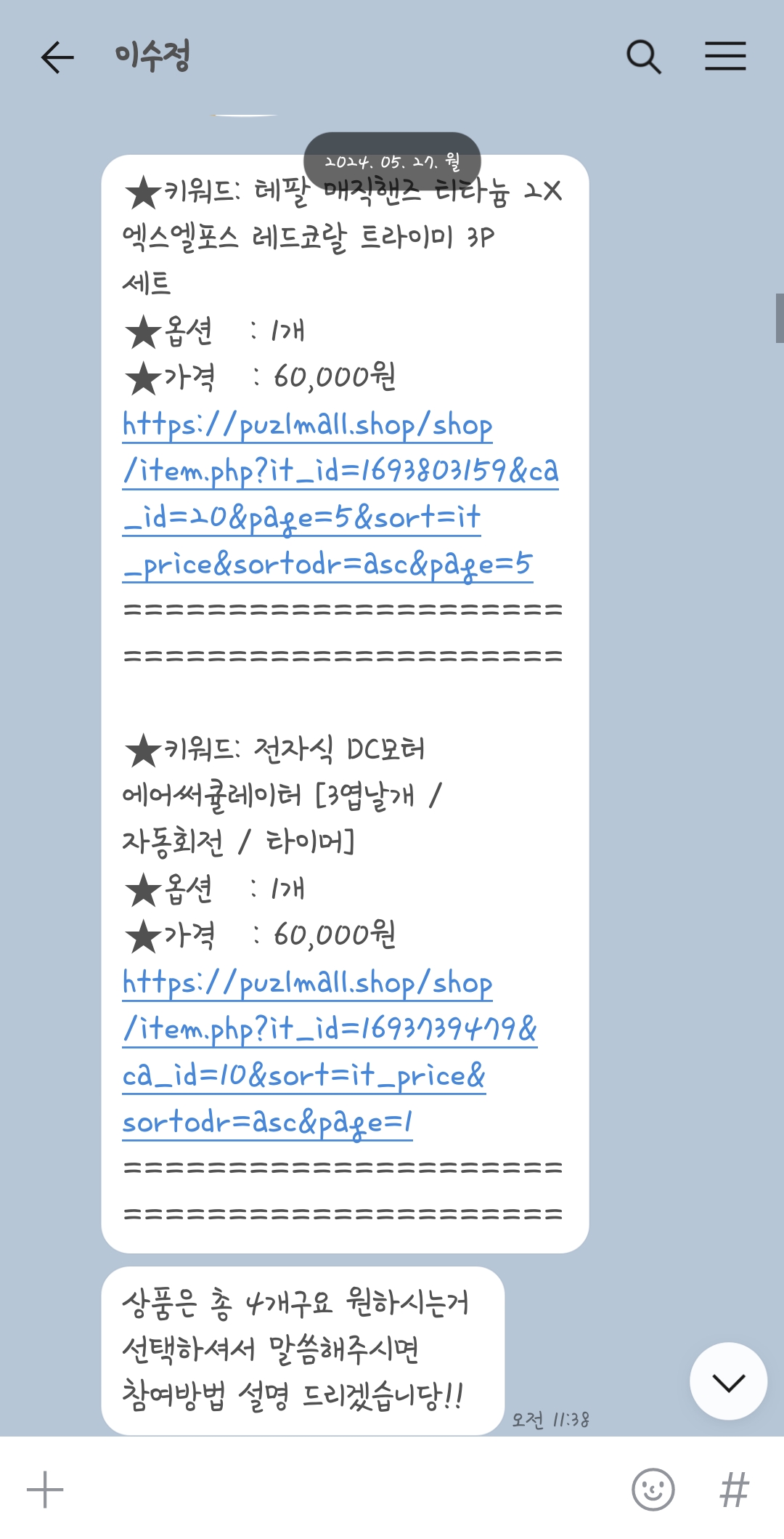 무료로 상품을 배송해줄테니 상품에 대한 리뷰 1개만 간단하게 작성해주는 일이라며, 진행 의사가 있으면 퍼즐몰 홈페이지 링크를 보내준다고, 사이트 들어가서 상품 선택해주면 된다고 했어요. (솔깃하긴 하지만 세상에 공짜는 없지)