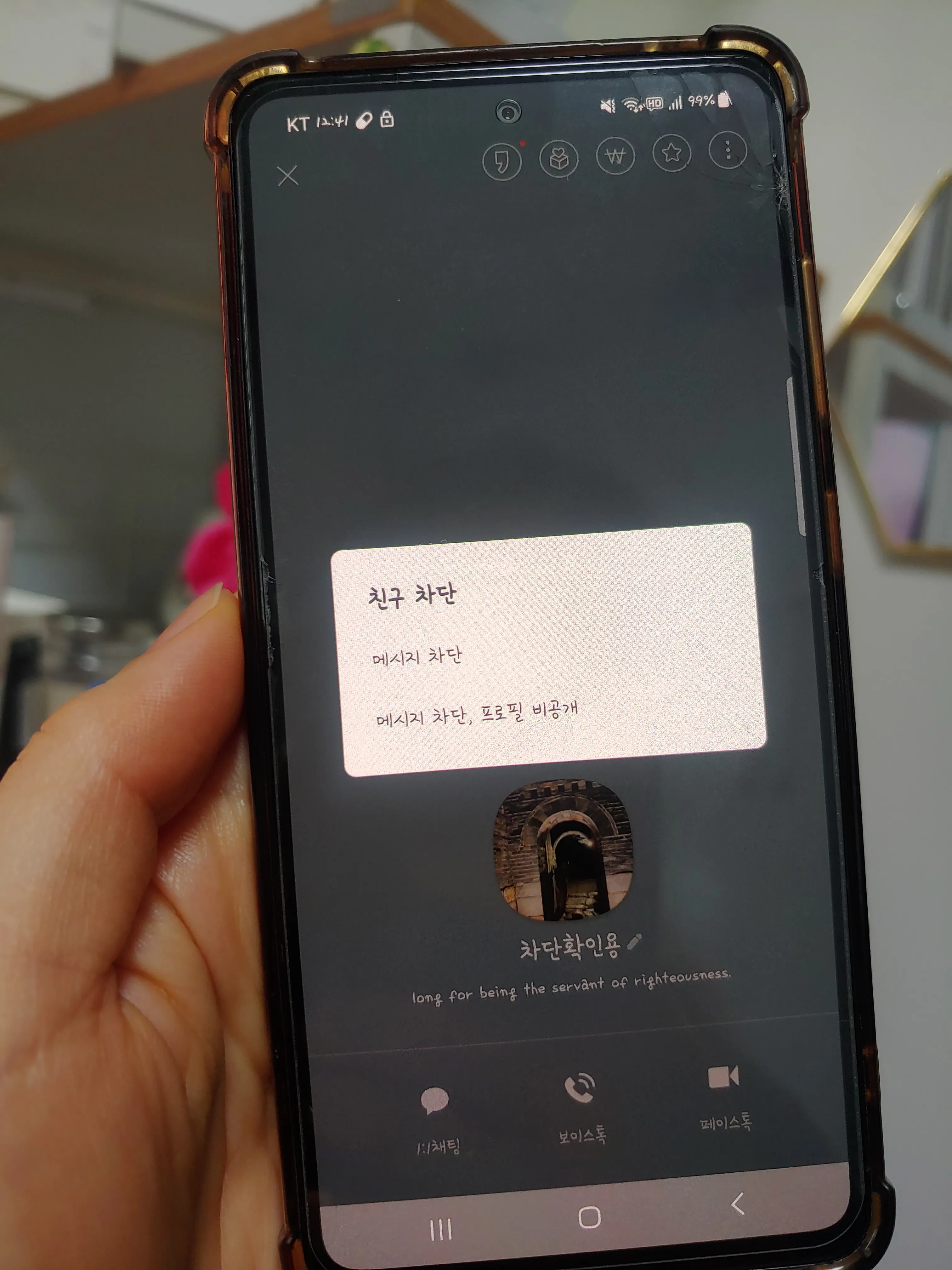 상대방이 내 프로필 사진, 상태 메시지, 배경 이미지 등을 볼 수 없게 하는 것입니다. 이 경우, 나의 최근 동향을 상대방이 파악할 수 없습니다.