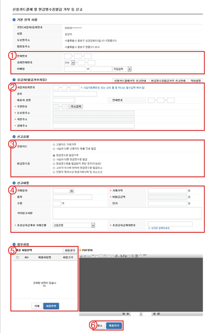 저는 다행히 사업자등록번호는 몰랐어도 상호는 확실하게 알고 있었기 때문에 상호와 대표자 성명, 업체 전화번호와 주소를 입력하고 거래일자, 거래가액, 현금지급일자, 미발급금액에 대해 입력한 뒤 포상금지급계좌 거래은행과 계좌번호를 입력했어요.