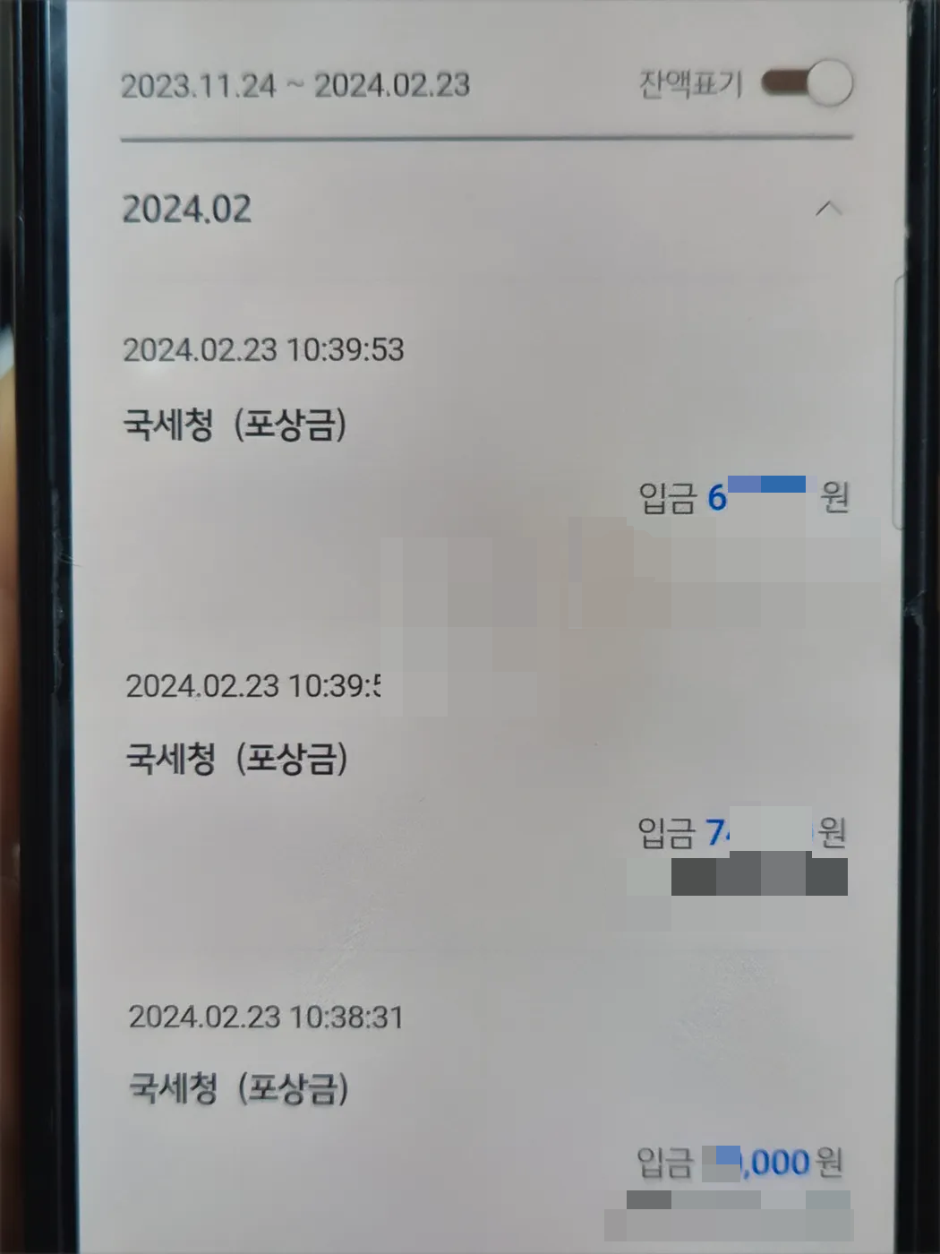 다행히 세무서 전화를 받고 난 10일 정도 뒤에 현금영수증은 제대로 발행이 되었고, 그 후 딱 1개월이 지나서 아침에 띵동 메시지가 날아와서 확인해 보니 포상금 지급 내역으로 약 20% 가까이 되는 돈(약 20만 원 정도)이 요청했던 은행 계좌로 입금이 되었답니다.