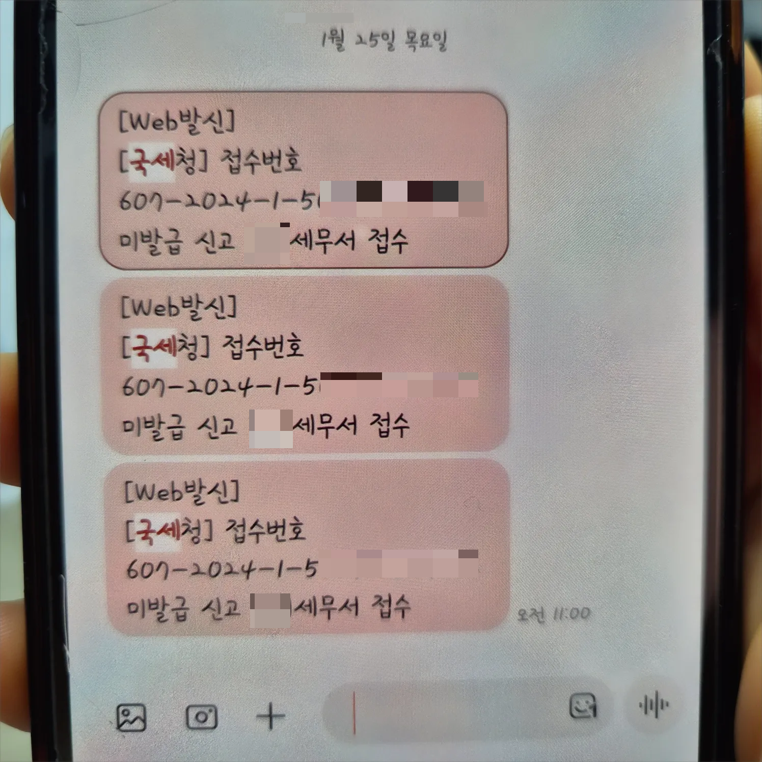 추가로 캡처해 놓은 거래 내역과 대화 내역을 첨부했더니 등록이 완료되던데요. 신고한 지 약 3주 만에 국세청 지역 세무서에서 현금영수증 미발급 신고 접수가 되었다는 문자가 왔어요.