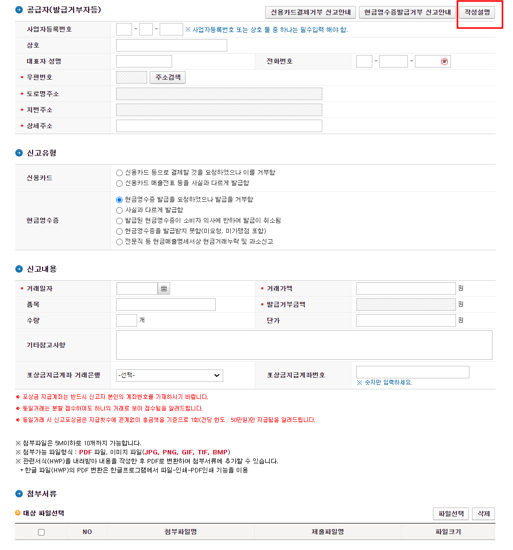 혹시나 작성하다 잘 모르겠으면 우측 맨 위 작성설명을 참고하면 자세한 도움을 받을 수 있으니 참고하면 손쉽고 간단하게 신고할 수 있답니다.