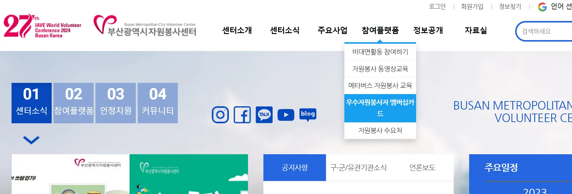 부산의 경우 자원봉사증을 발급받으려면 온라인으로 부산자원봉사센터홈페이지 접속해서 회원가입 후 로그인, "참여플랫폼" 탭에서 우수자원봉사자 멤버십카드를 신청하면 됩니다.