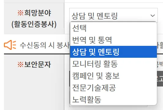 활동인증봉사 희망분야에는 번역 및 통역, 상담 및 멘토링, 모니터링 활동, 캠페인 및 홍보, 전문기술제공, 노력활동 등을 체크할 수 있습니다. 봉사 부가 정보 입력란은 봉사희망지역이나 직업, 개인전문분야를 기재하도록 되어 있는데 선택 사항이라 넘어가도 됩니다.
