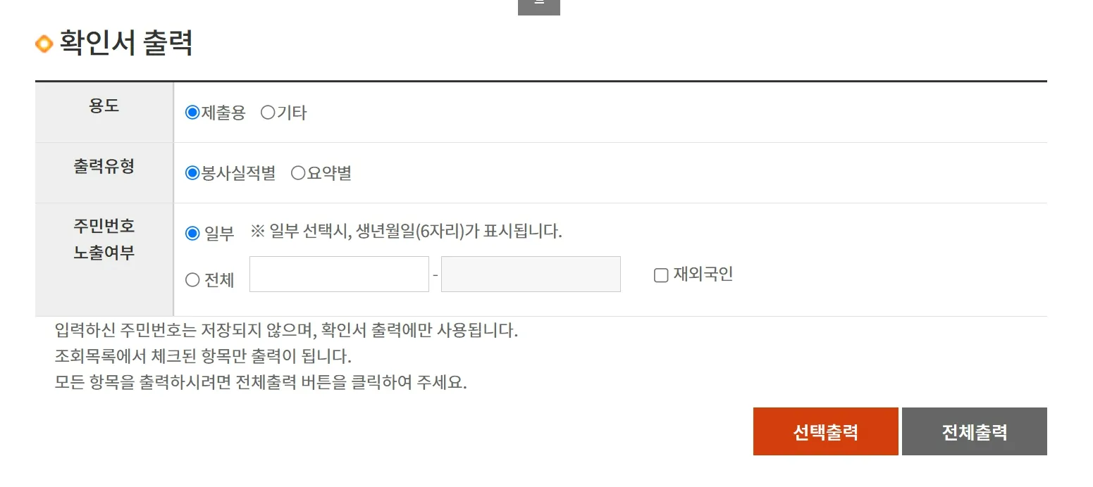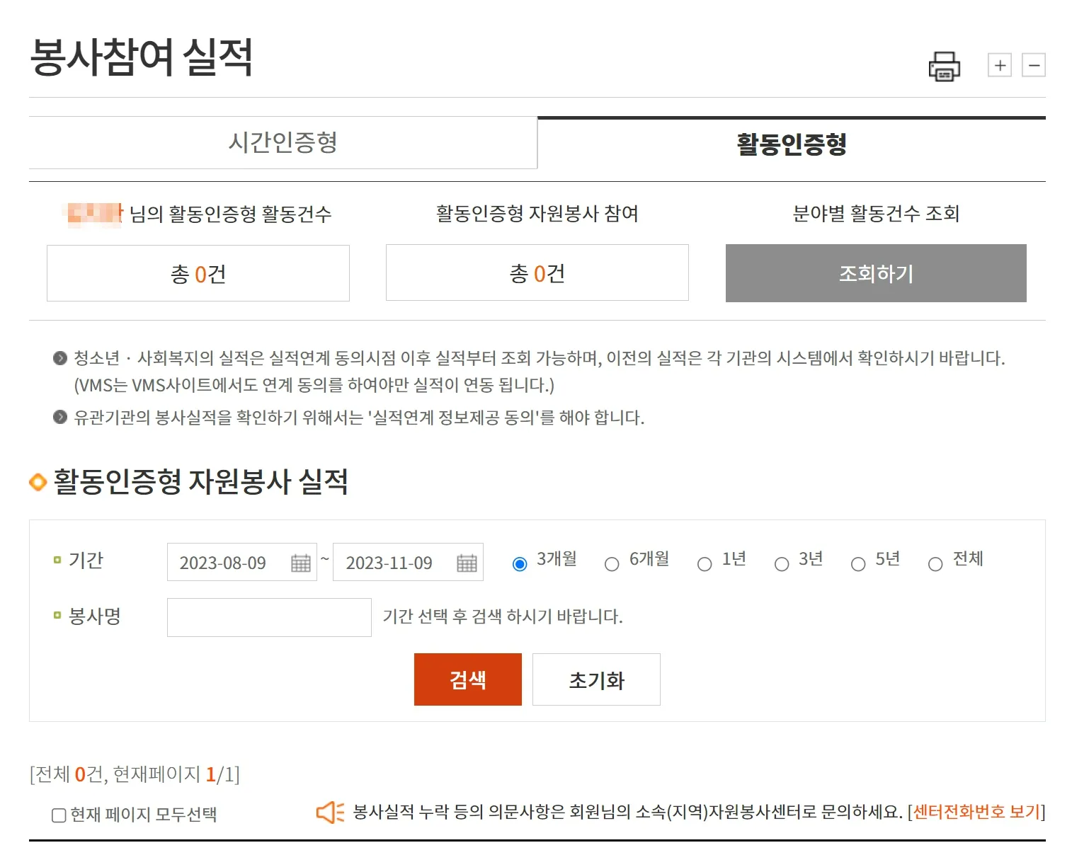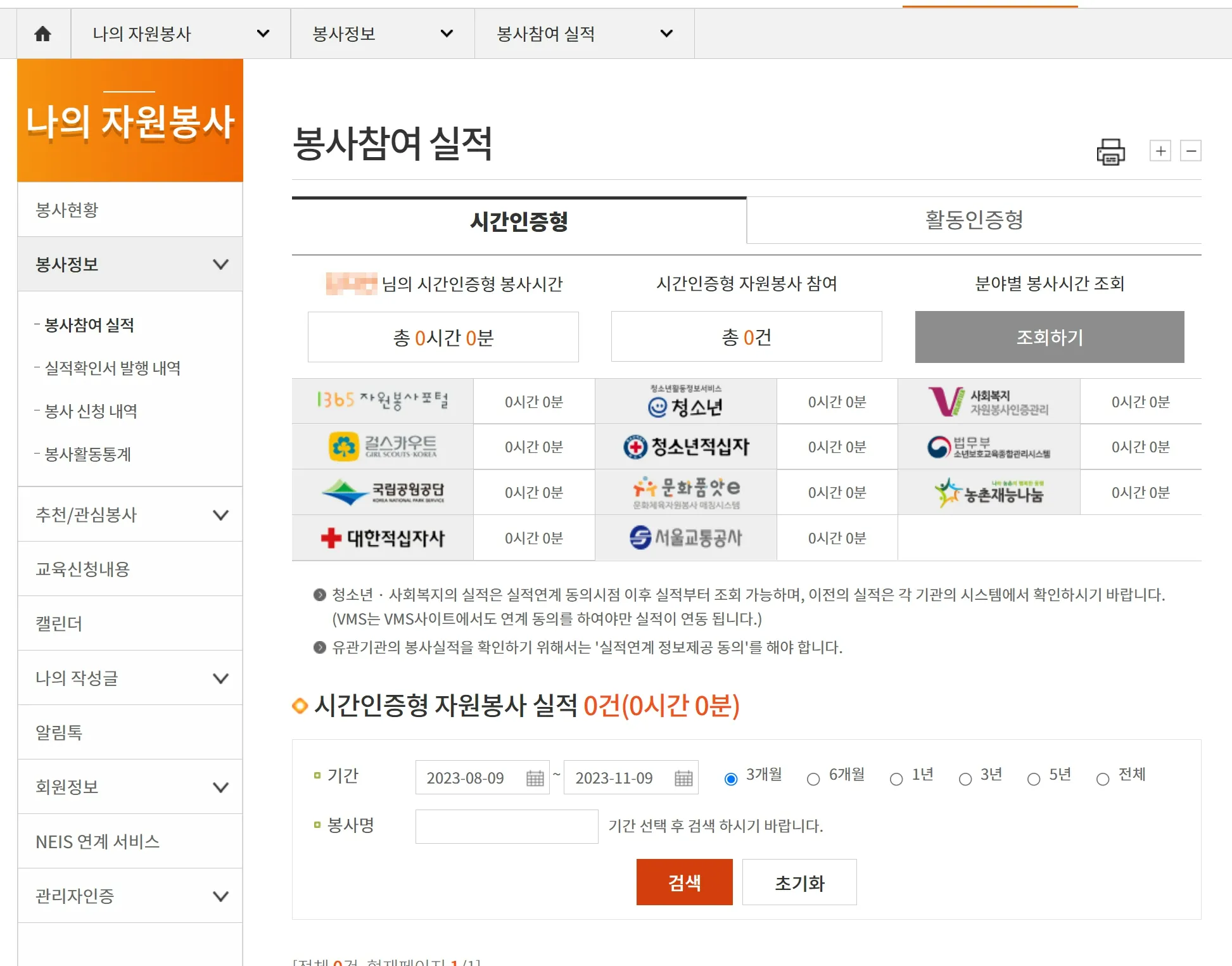 나의 봉사 실적을 나이스(교육행정정보시스템 NEIS)와 연계하고 싶다면 정보제공에 반드시 동의해야 합니다. 동의하지 않았다면 동의 안내란으로 이동되어 한번 더 실명인증이 필요합니다.
