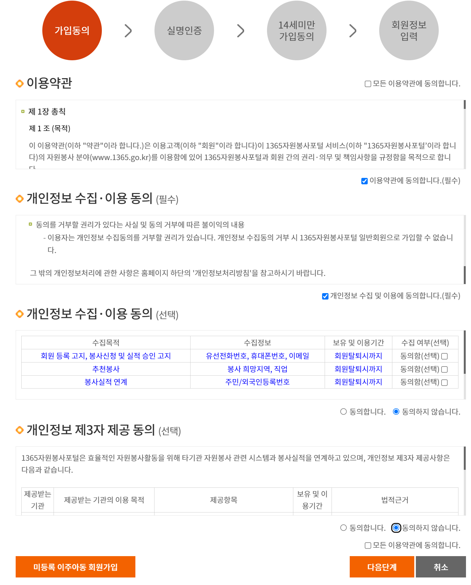 1365 자원봉사포털에 가입하려면 먼저 홈페이지 접속 후 회원가입을 해야 합니다. 그다음 이용 약관과 개인정보 수집 및 이용 동의에 필수란만 동의를 체크하고 다음으로 넘어갑니다. 실명인증 단계에서는 주민등록번호나, 본인 명의 핸드폰, 아이핀 서비스를 통해 본인 인증을 할 수 있습니다.