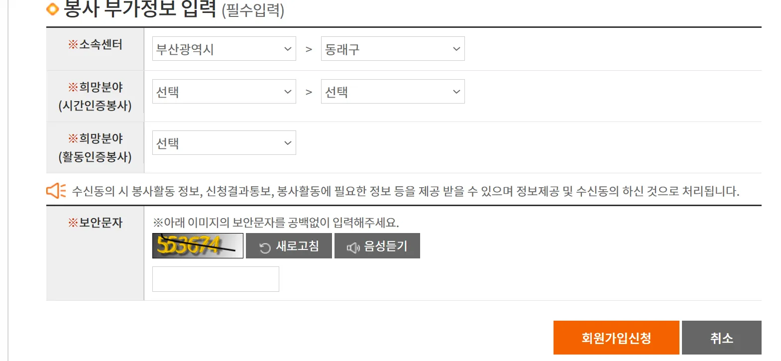 개인정보를 입력하고 소속센터와 시간인증봉사, 활동인증봉사 등 희망 분야를 입력하고 보안문자를 입력 후 회원가입 신청을 클릭하면 됩니다. 봉사활동 희망분야는 생활편의지원, 주거환경, 상담, 교육, 보건의료, 농어촌 봉사, 문화행사, 환경보호, 행정보조, 안전 및 예방, 공익 및 인권, 재해 및 재난, 국제협력 및 해외봉사, 멘토링, 기타 등을 선택할 수 있습니다.