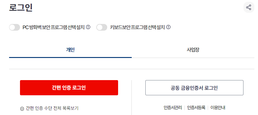 로그인은 공동인증서, 금융인증서, 또는 카카오톡과 같은 간편 인증 방법을 사용할 수 있습니다. 공인인증의 절차가 많이 간소화되었기 때문에 더욱 편리하게 이용할 수 있도록 도와줍니다.